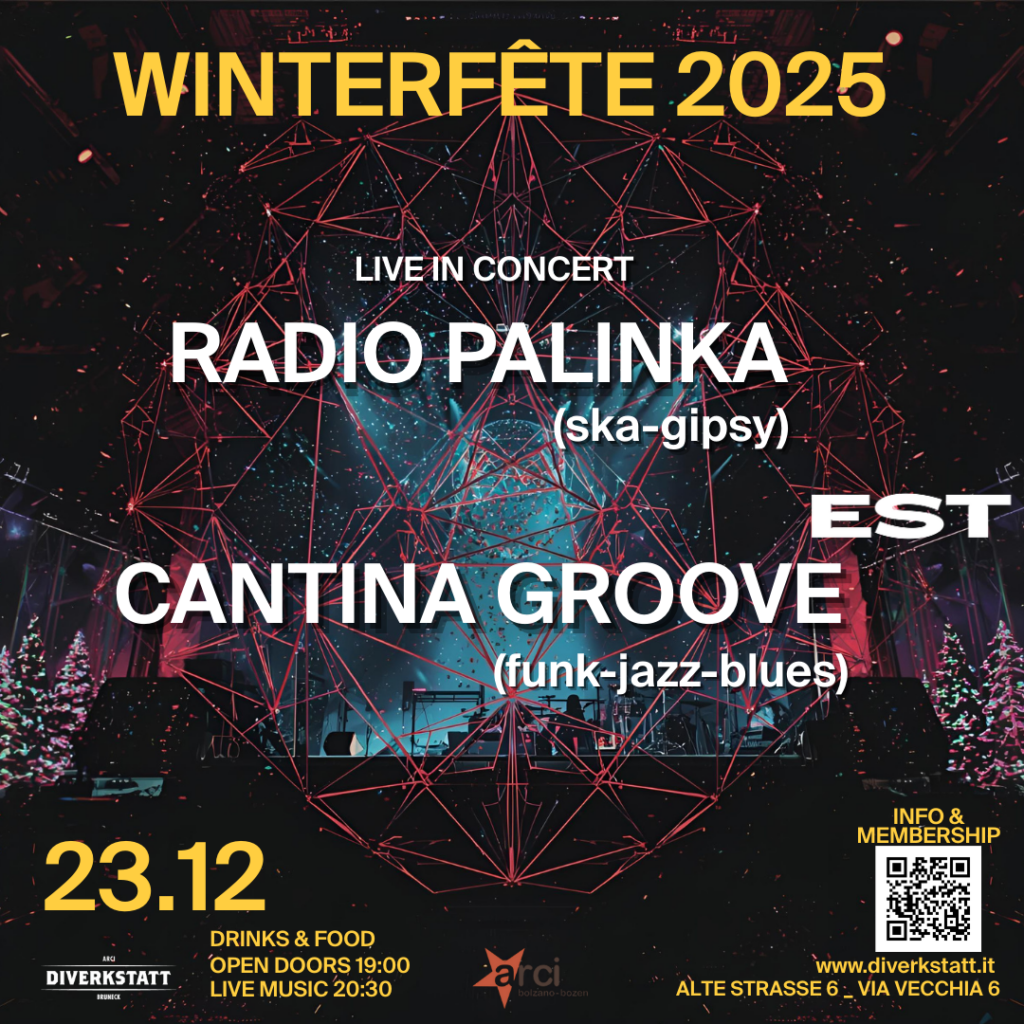 Winterfete 2025 – Info Box Date: 23 DecemberLocation: EST – Bruneck/BrunicoDoors: 19:00First gig: 20:30 Line-up:• Opener: Cantina Groove (local jazz/funk)• Headliner: Radio Palinka (ska / Balkan-Patchanka) Extras: Feuerstelle, DIY drinks