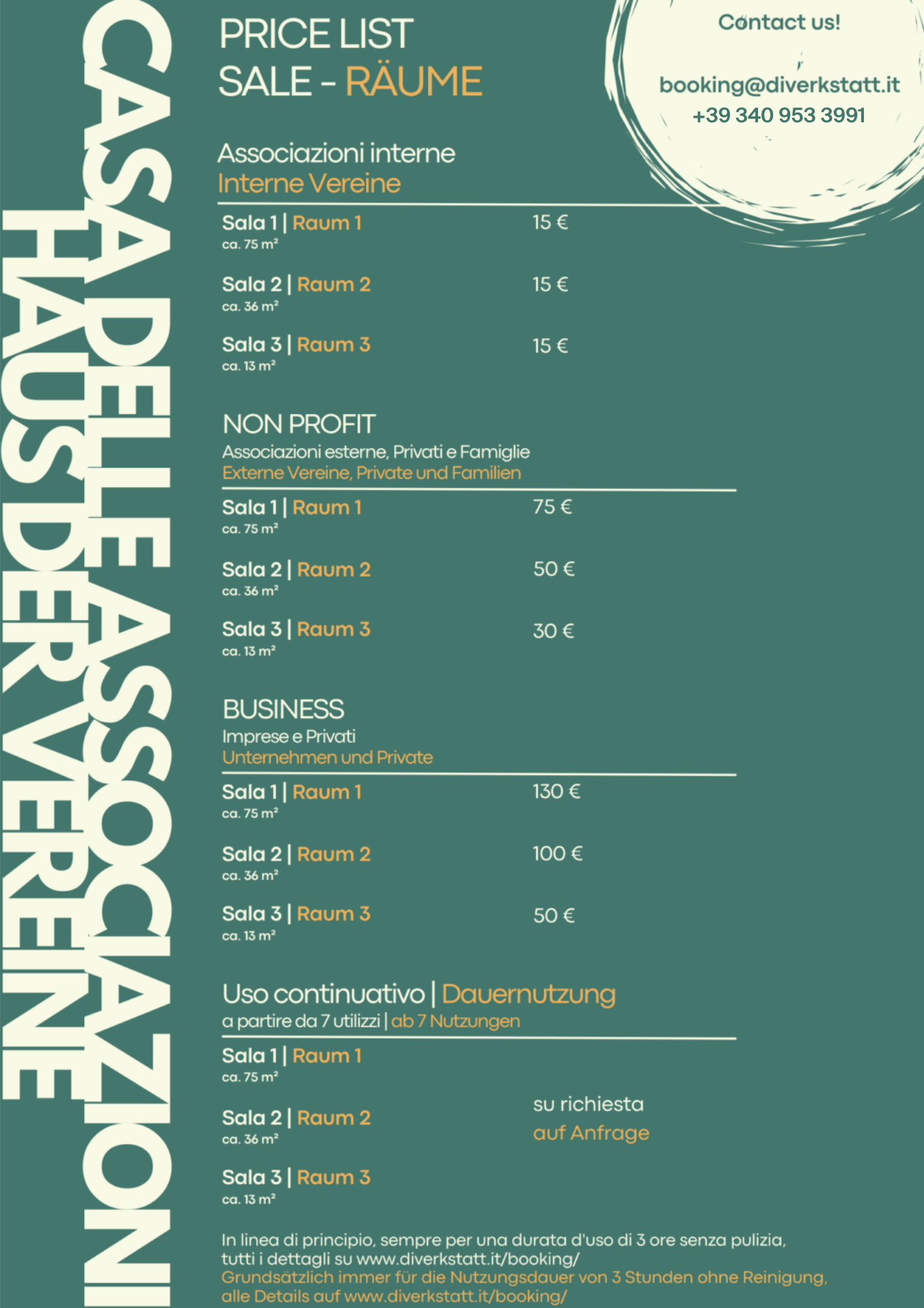 Benvenuti nella Casa delle Associazioni! Qui troverete il listino prezzi e il calendario per verificare la disponibilità degli spazi.