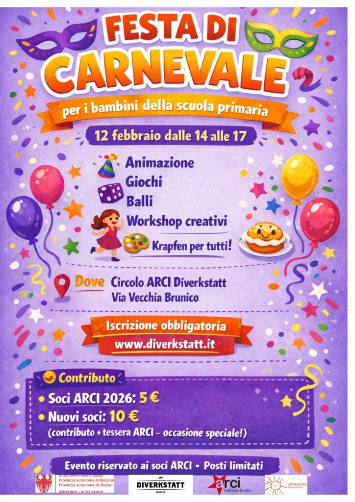 La festa di carnevale per la scuola primaria! Animazione! Giochi e balli! Workshop creativi! Non mancheranno i krapfen! Contributo per soci ARCI 5€ Nuovi soci: prezzo speciale di 5€ +